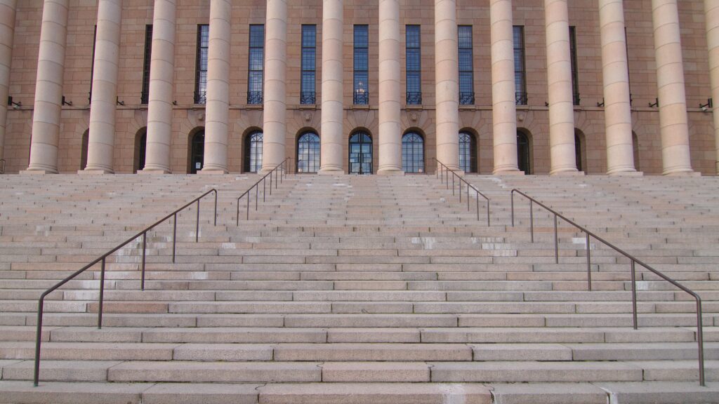 Eduskuntatalon pylväät sotkettiin punaisella värillä 25. syyskuuta 2024.