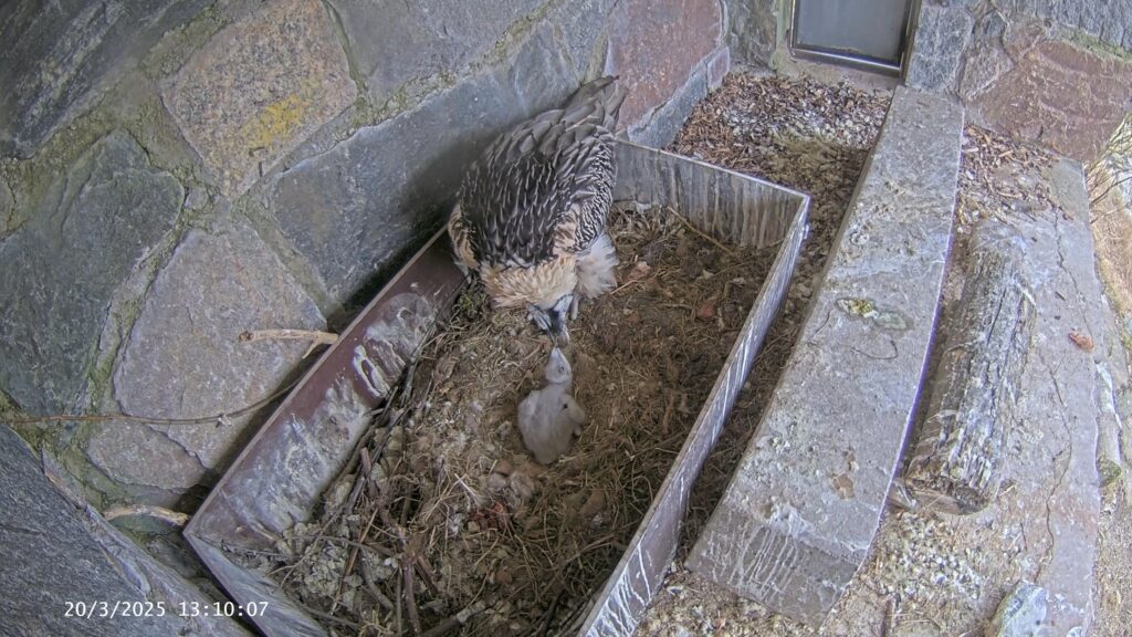 Korkeasaaren partakorppikotkien pesässä sirkuttaa kuukauden ikäinen poikanen.