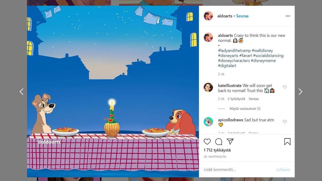 Taiteilijan piirroksissa nähdään muun muassa Aladdin kerryttämässä karanteenikiloja.