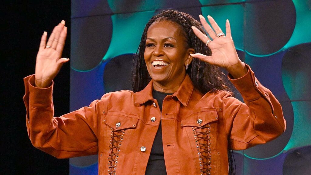Michelle Obama oli valinnut ylleen rennon farkkumekon. Hän piti turnauksessa myös puheen.