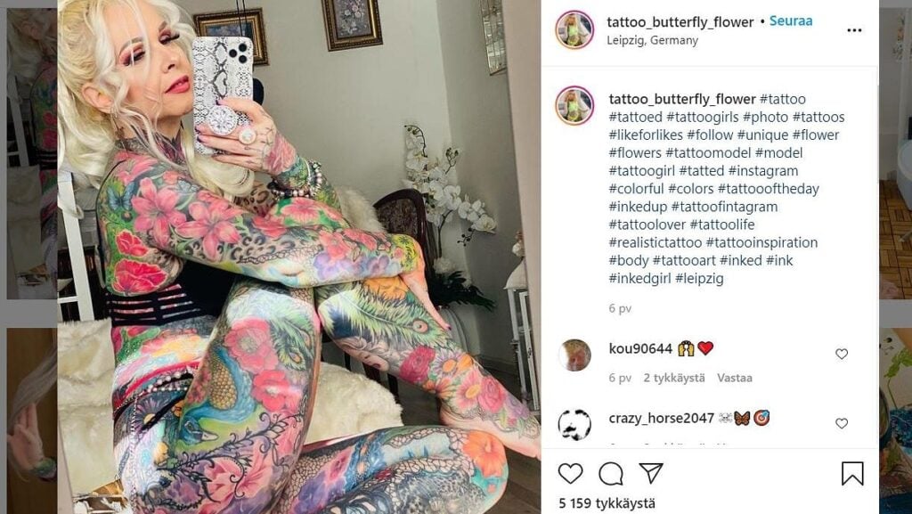 Saksalainen Kerstin Ehe työskentelee tätä nykyä tatuointimallina.