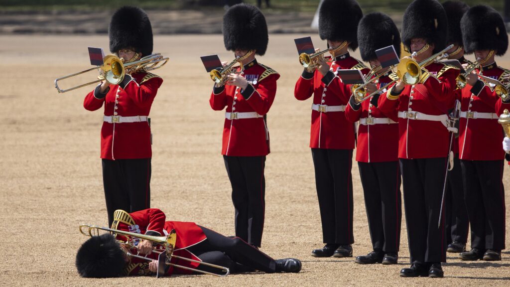 Brittisotilas jatkoi pasuunan soittamista pyörtymisestä huolimatta.