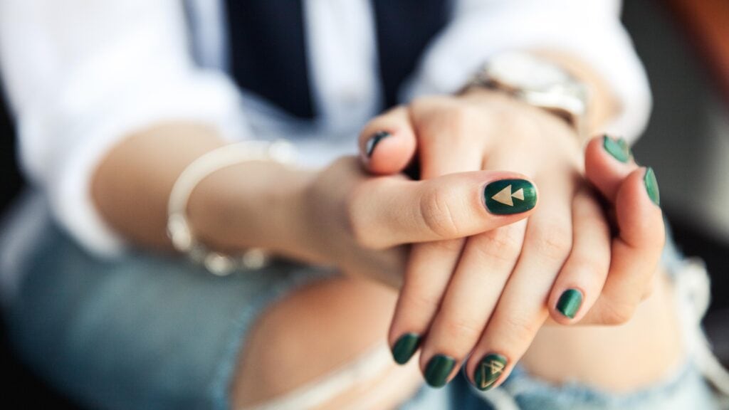 Syvän vihreän värin lisäksi manikyyriä koristellaan erilaisin kuvioin.