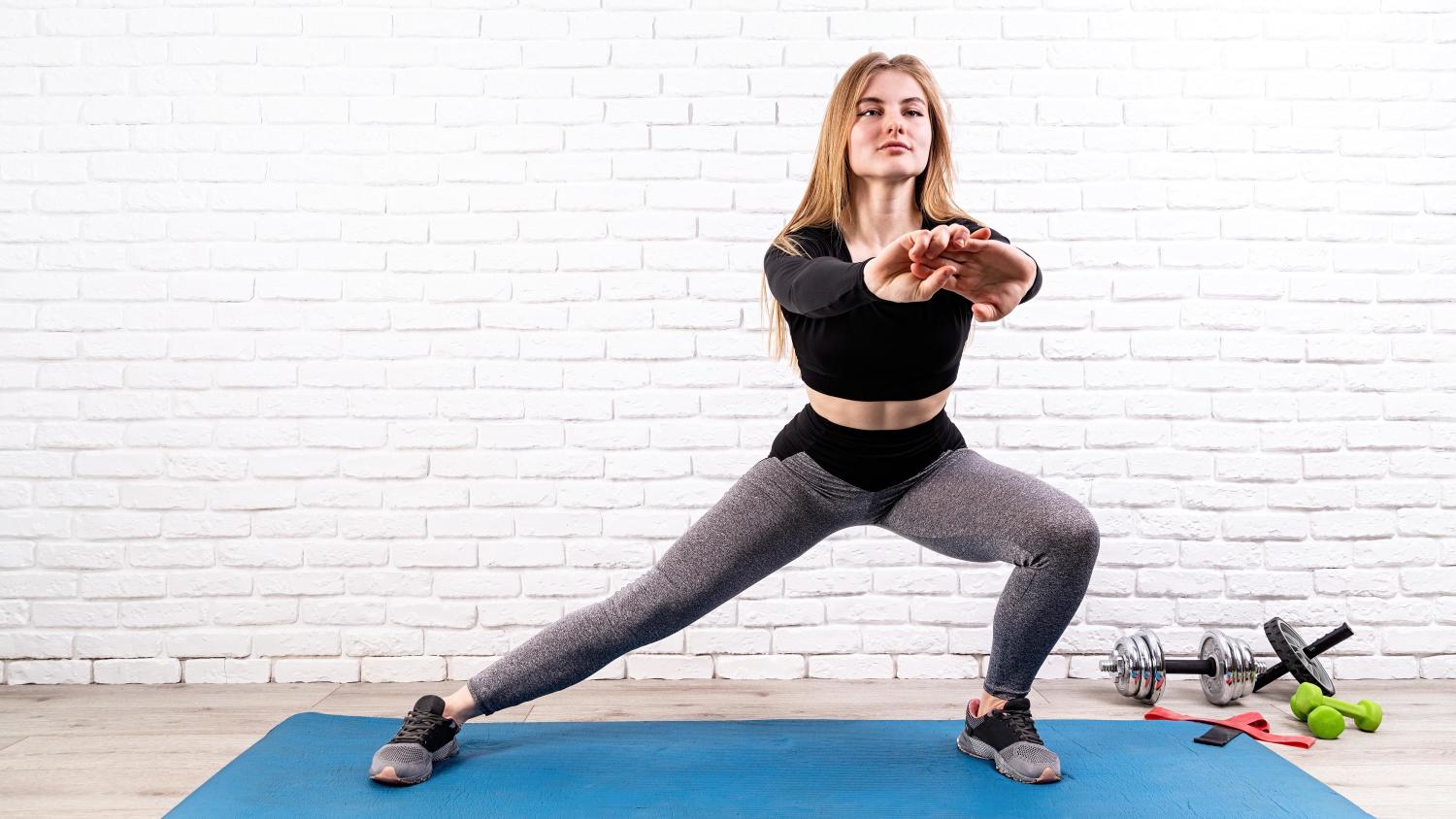 Kyykkää niin syvälle kuin pääset ja venytä sivulle liukuvaa jalkaa niin pitkälle kuin notkeutesi antaa periksi.