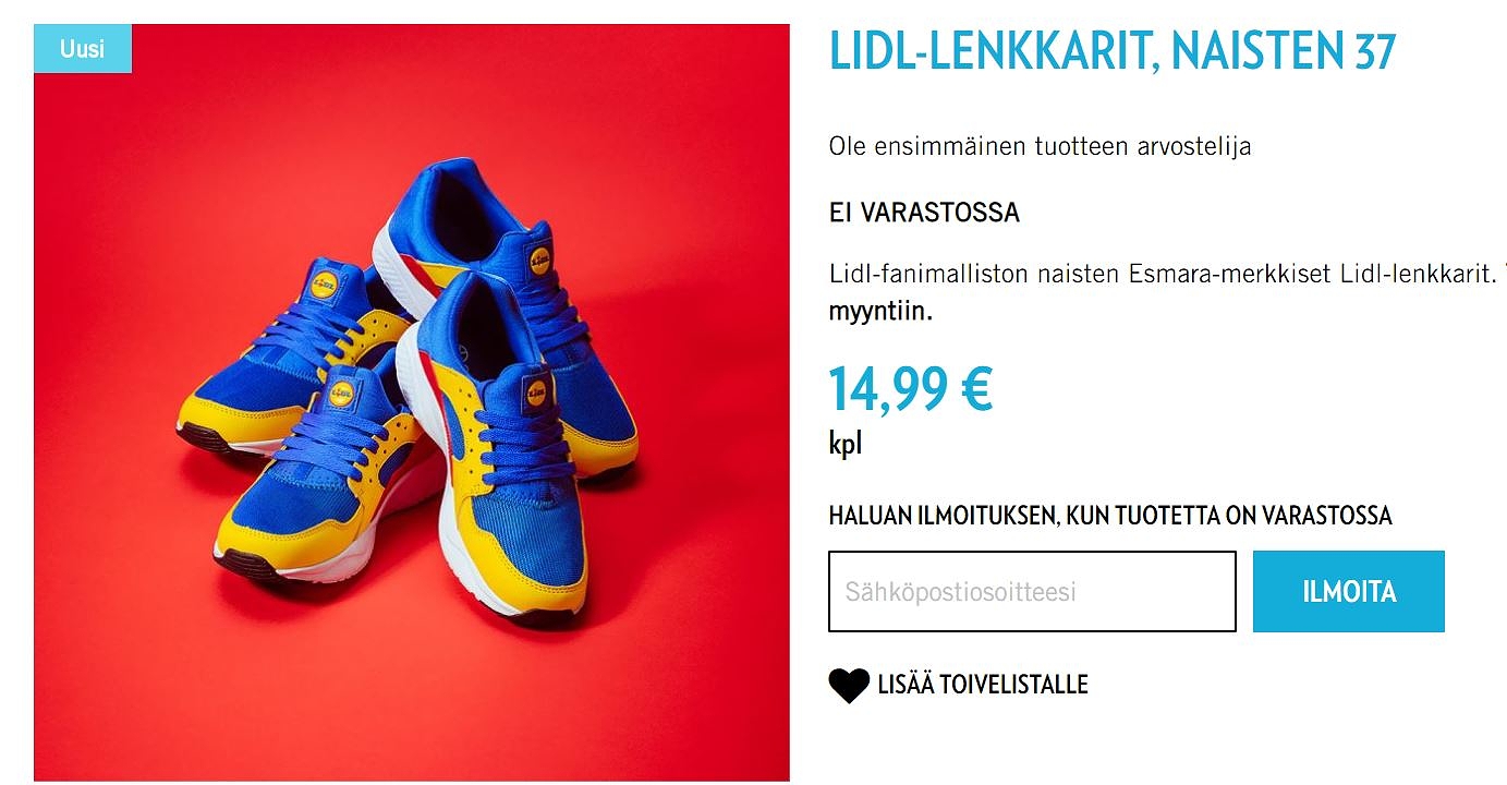 ”Aprillipilasta syntyneet Lidl-lenkkarit menivät kuin kuumille kiville, kun ne lanseerattiin supereksklusiivisesti Saksassa viime syksynä. Lukuisten Lidl-fanien ja sneaker-harrastajien toiveesta uusi erä rennon retroja kohulenkkareita ovat nyt nähneet päivänvalon, ja tällä kertaa ne tulevat saataville myös Suomessa,” Lidlin sivuilla kerrotaan.