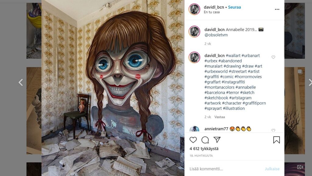 Espanjalainen grafittitaiteilija David työstää uskomattoman upeita taideteoksia hylättyihin taloihin. Karmivat taideteokset ovat usein inspiroituneet kauhuelokuvista, joten ne lisäävät entisestään hiljaisen, rapistuneen ja hylätyn talon karmivaa tunnelmaa.