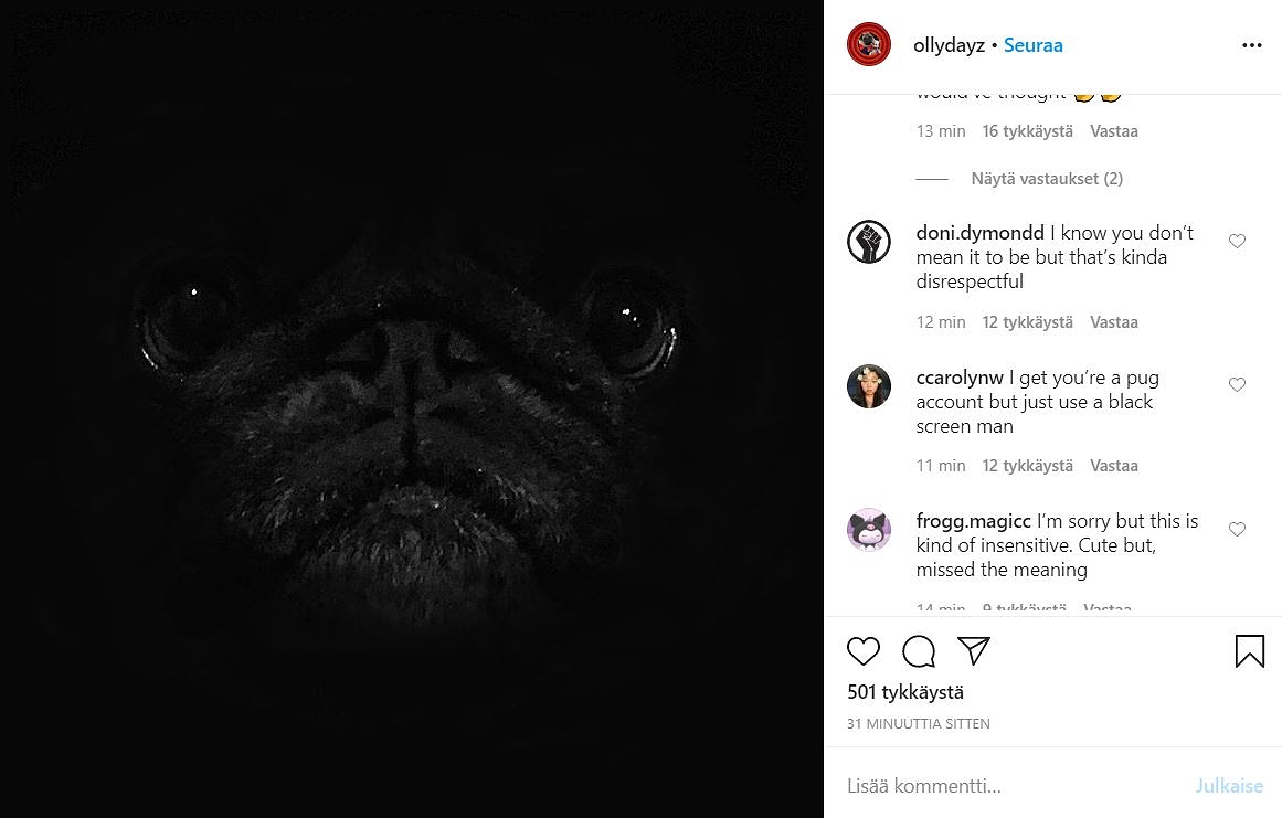 Kun #theshowmustbepaused-aihetunnisteella selaa Instagramin julkaisuja, vastaan tulee pelkkiä mustia ruutuja ja poikkeuksena joissain kuvissa nähdään myös kampanjan hashtagit. Kuvavirrassa yksi kuva kuitenkin erottuu joukosta. Yhdessä kuvaruudussa nimittäin tuijottaa koiran musta naama. Kuva on ladattu Ollydayz-nimiselle Instagram-tilille, jota seuraa yli 38 000 ihmistä. Tilillä jaetaan kuvia Olly-nimisestä mopsista.