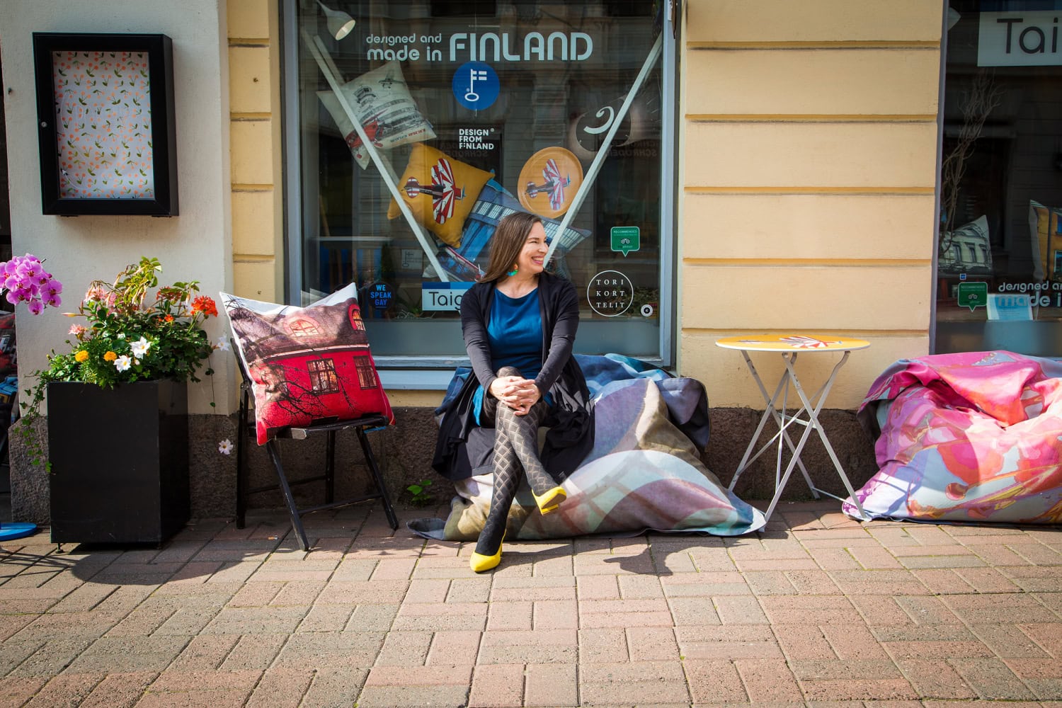 – Kuvasin sen ennen kuin tulin töihin. Olisin halunnut jäädä fiilistelemään, mutta minun täytyi avata putiikki. Samoissa tunnelmissa suunnittelin kuvista tuotteita, mutta pohdin, että aihe on liian ajankohtainen. Heitin kuvat kuitenkin puolihuolimattomasti Facebookiin ja moni tarttui niihin. Tieto lähti leviämään. Parissa päivässä sain 27 ennakkotilausta tyynyistä, Jutta muistelee.