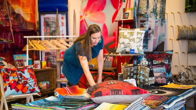 Helsingin Senaatintori ammottaa kaikessa komeudessaan autiona. Liikkeisiin ihmiset uskaltautuvat vielä varovaisemmin. Sadan metrin päässä Taiga Colors -putiikissa aukeaa värikäs maailma. Suunnittelija ja yrittäjä Jutta Kuure on ottanut lempeän niskaotteen koronasta ja pitänyt itsensä kiireisenä.