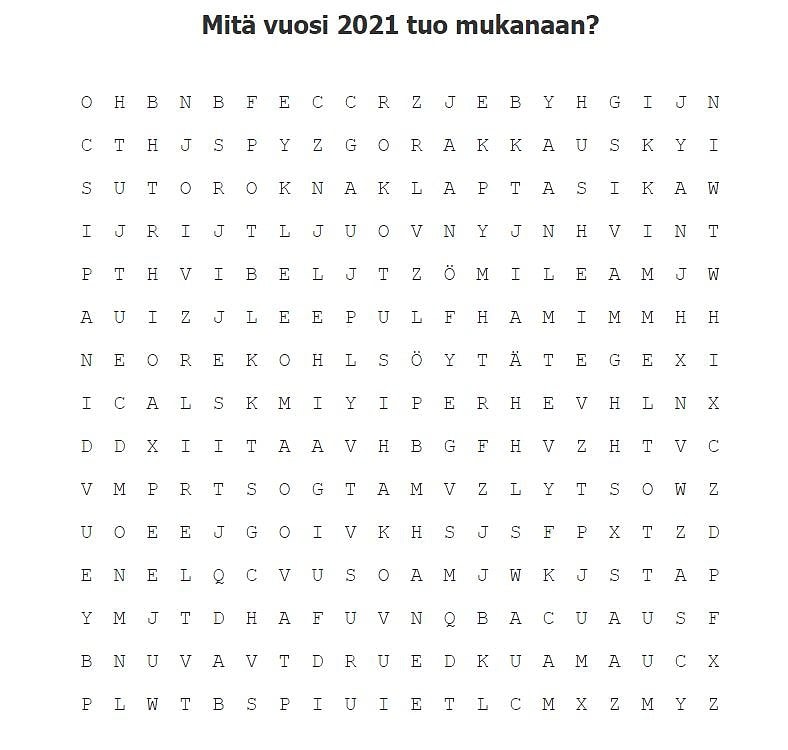 Vuosi 2021 on aivan nurkan takana. Vuosi 2020 oli monella tavalla erikoinen vuosi, joten moni varmasti odottaa vapaampaa ja normaalimpaa uutta vuotta. Se mitä vuosi mukanaan tuo, on toki vielä pimeän peitossa, mutta Voice.fi:n leikkimielisen sanapiilon avulla voit katsoa, mitä ehkä saattaa olla luvassa.