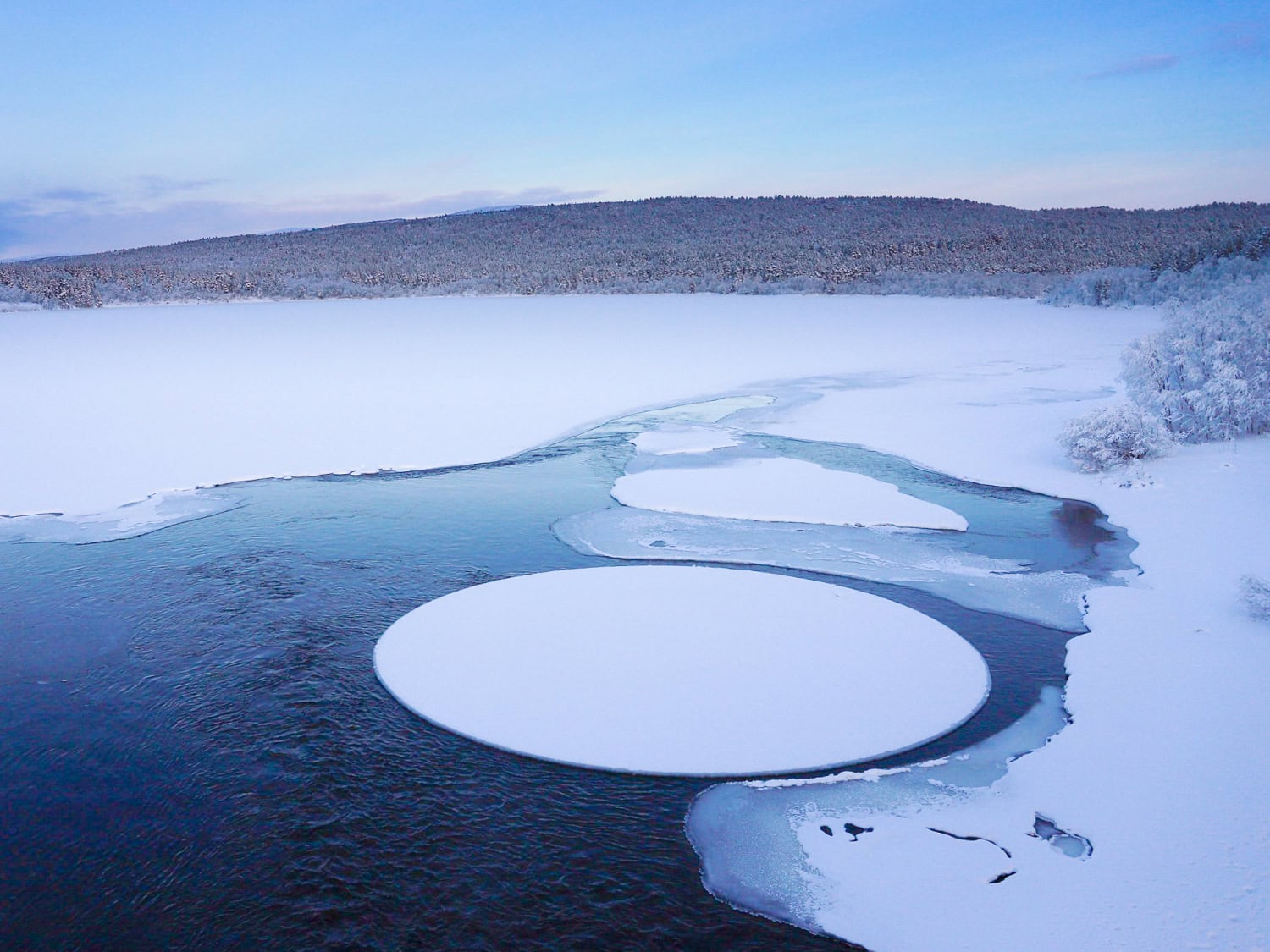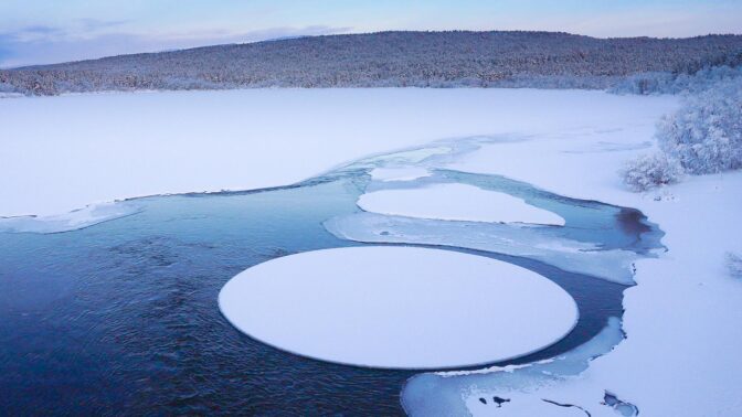Täydellisen pyöreä jäälautta on mitä todennäköisimmin muodostunut Utsjoella virtausten pyörittäessä lauttaa jäätä vasten. Kuten Sonja vitsaileekin omassa Instagram-julkaisussaan, jäälautta on kuin harpilla tehty ympyrä.