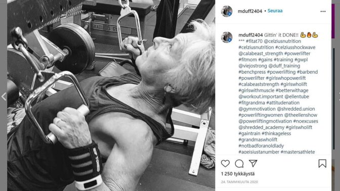 Mary Duffy, 71, suuntasi ensimmäisen kerran elämässään kuntosalille 12 vuotta sitten. Tuolloin kimmokkeena oli elämäntapamuutos ja painonpudotus. Harrastus vei kuitenkin Duffyn täysin mennessään ja nykyään nainen viettää kuntosalilla 20 tuntia viikossa.
