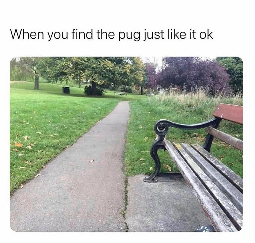 Vastaus kuvaan: Mopsi kurkkaa penkin käsinojan reiästä.