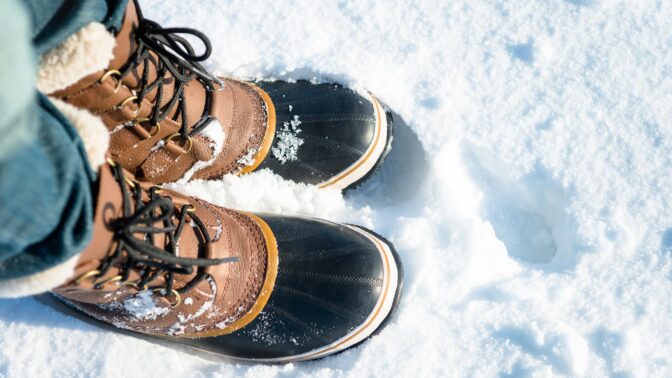 Myös kenkävalintaan kannattaa kiinnittää pakkasella huomiota. Tukevat, vedenkestävät vaelluskengät lämpimien, esimerkiksi merinovillaisten sukkien kanssa, ovat oiva valinta pakkasulkoiluun.