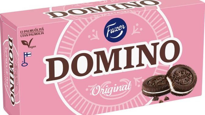 Fazerin rakastettu Domino-täytekeksi juhlii tänä vuonna 70-vuotista taivaltaan. Keksi tunnetaan herkullisen makunsa lisäksi myös tutusta vaaleanpunaisesta pakkauksestaan, sekä omalemaisesta kuvioinnistaan.