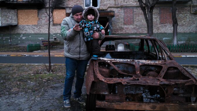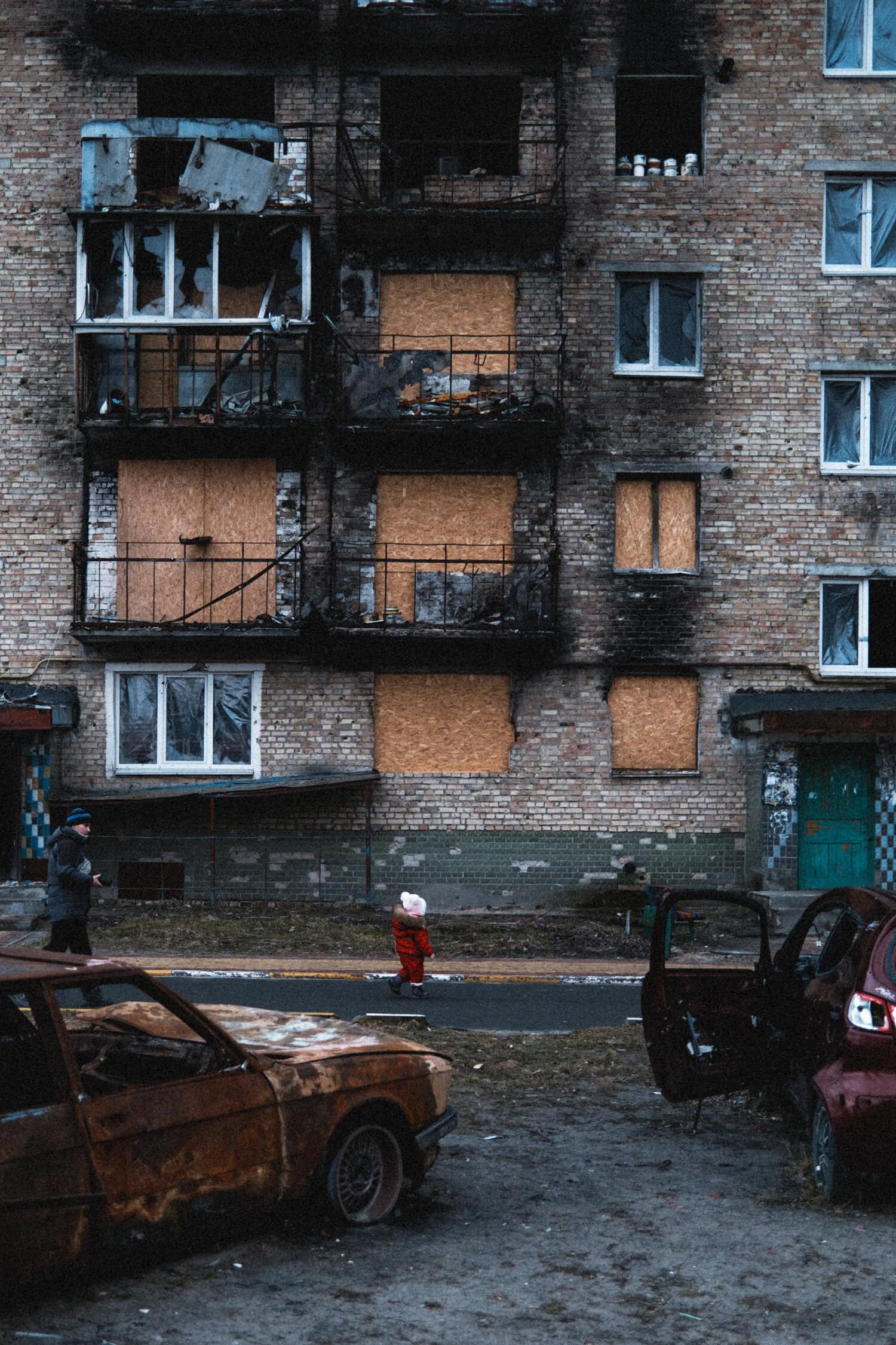 Tulevaisuudesta ja toivosta pilkahduksia Pirskanen tallensi kameraansa Butšan kaupungissa lähellä Kiovaa. Kaupungissa sodan tuhot olivat vahvasti esillä palaneina autoina ja tuhoutuneina rakennuksina.