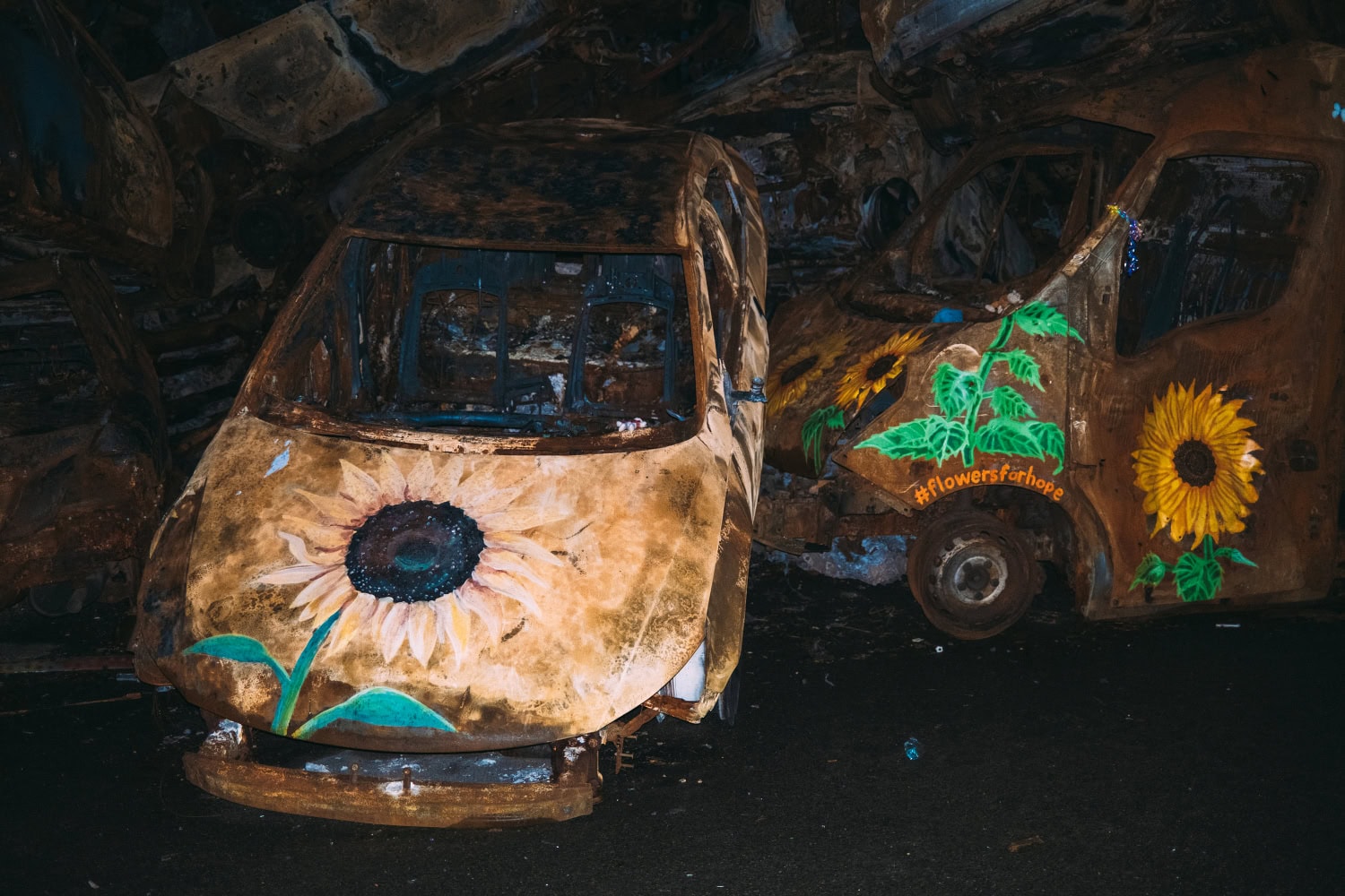 Toivo näkyi myös auringonkukissa. Tuhoutuneisiin autoihin ja rakennuksiin oli maalattu keltaisena hehkuvia auringonkukkia. Yhteen palaneeseen autoon oli kirjoitettu #flowersforhope.