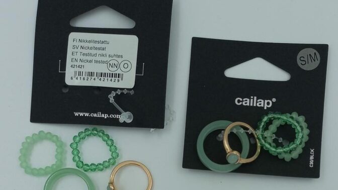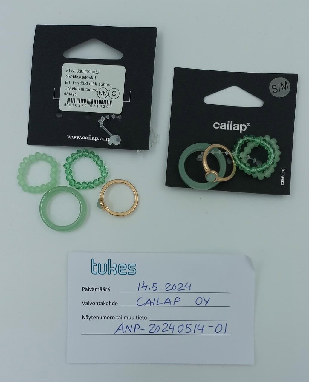 Turvallisuus ja kemikaalivirasto Tukes kertoo, että Cailap Finlandin sormussetti vedetään pois myynnistä. Syynä on setissä olevan metallisen sormuksen kadmiumpitoisuus, joka ylittää sallitut rajat. Muut kolme korua eivät ole metallia.