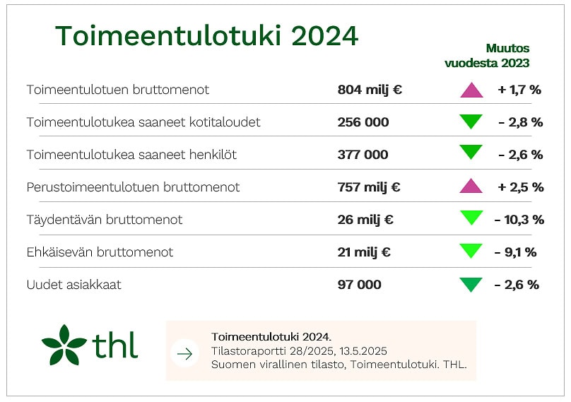 Vuonna 2024 toimeentulotuen menot olivat 804 miljoonaa euroa, kertoo THL. Edellisvuoteen verrattuna menot kasvoivat 1,7 prosenttia.
