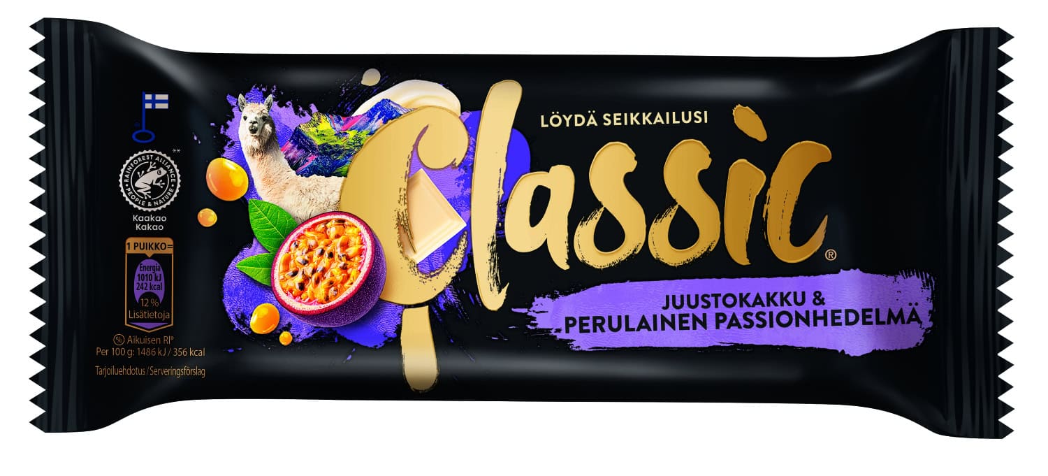 Classicin uutuusjäätelö tuo yhteen makean juustokakun ja raikkaan passion-hedelmän, ja yhdistelmä tuntuu toimivalta. Valkosuklainen juustokakku on kuitenkin makuna niin tuhti, että raati arvelee kokonaisen puikon yksin syötynä olevan monelle jopa liikaa. Jäätelössä on kuitenkin selvästi lähdetty hakemaan jotakin aivan uutta makuparia ja siinä myös onnistuttu. Myös kuoren kivasti rouskuvat crunchit tuovat kivan lisän jäätelöön.