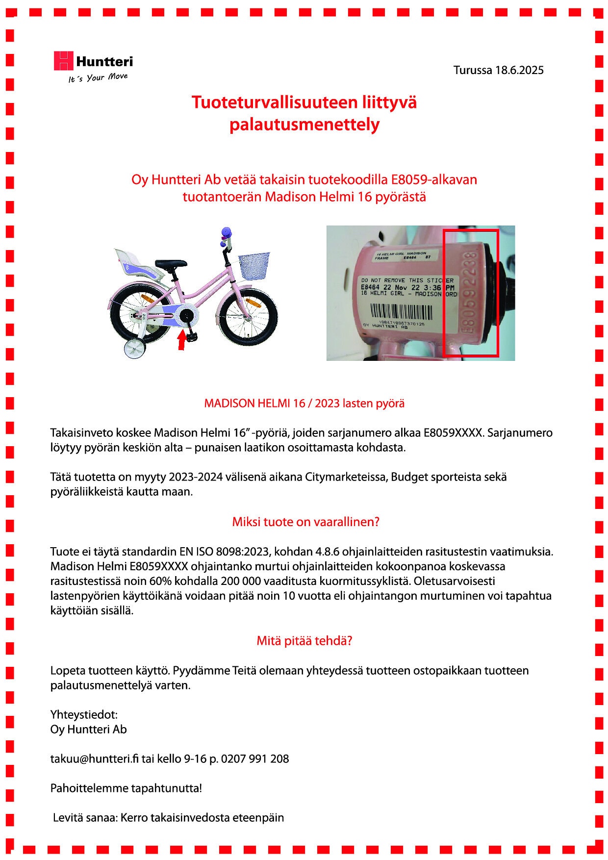 Oy Huntteri Ab kertoo vetävänsä myynnistä lastenpolkupyöriä. Syynä takaisinvetoon on tiedotteen mukaan se, että tuotteen ohjaustanko ei täytä turvallisuusvaatimuksia.