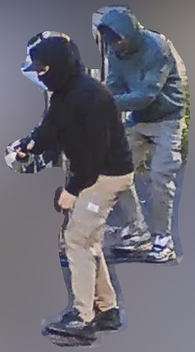 Toisella epäillyistä on ollut tekohetkellä yllään mahdollisesti musta huppari, beiget housut, tummat lenkkarit ja musta lippis. Toinen epäilty on saattanut pukeutua sinisen tai vihreän sävyiseen takkiin, harmaisiin housuihin, raidallisiin lenkkareihin ja lakkiin. Molemmilla on ollut kasvot peitettyinä.