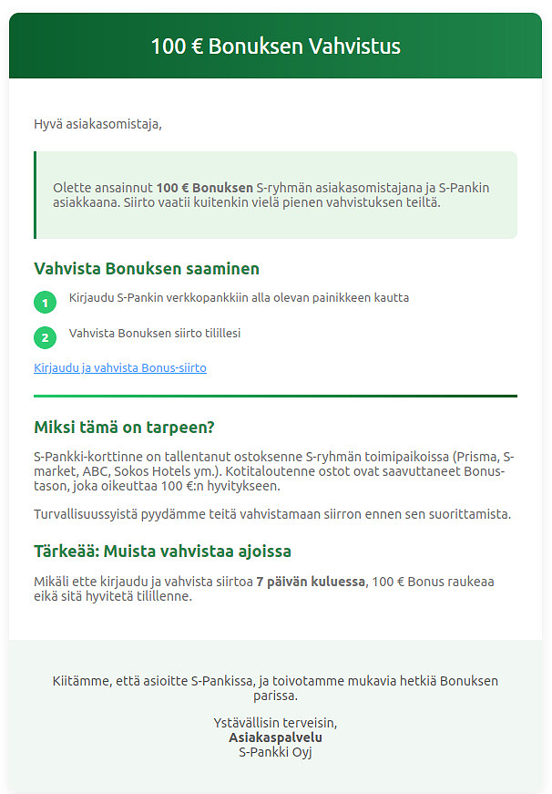 Viesteissä vastaanottajaa pyydetään kirjautumaan S-pankin verkkopankkiin bonuksien maksua varten. Viestissä kerrotaan, että vastaanottaja on ansainnut 100 euron bonuksen S-ryhmän asiakasomistajana ja S-pankin asiakkaana. ”Bonuksen” saadakseen, vastaanottajan pitäisi vahvistaa maksun siirto viestissä olevan linkin kautta.