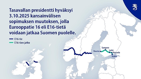 Suomeen tulee uusi valtatie, kertoo Valtioneuvosto tiedotteessaan. Eurooppatie, eli E16-tie kulkee nykyisellään Pohjois-Irlannista Skotlannin ja Norjan kautta Ruotsin Gävleen.