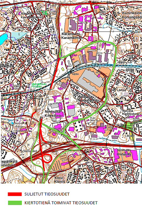 Uudenmaan ELY-keskus on julkaissut kuvan suljetuista ja kiertoteinä toimivista tieosuuksista. Voit katsoa sen alta.