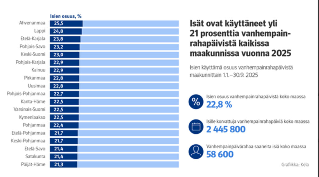 Ahvenanmaa erottuu tilastoissa. Siellä isät ovat vuoden 2025 ensimmäisten yhdeksän kuukauden aikana käyttäneet jo yli neljänneksen kaikista vanhempainrahapäivistä. Myös Lapissa isien osuus on noussut lähes neljännekseen, ja isät ovat käyttäneet kaikissa maakunnissa vähintään yli 21 prosenttia vanhempainpäivärahapäivistä.