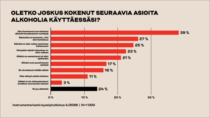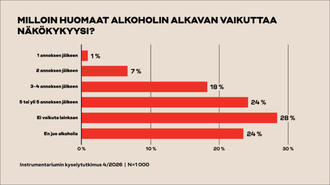 Suomalaiskyselyn mukaan suurin osa huomaa alkoholin vaikutukset näköönsä vasta useamman annoksen jälkeen, vaikka todellisuudessa muutokset voivat alkaa jo ensimmäisestä lasillisesta.