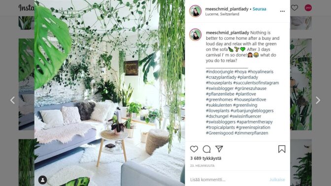 Mukana on siis kasviharrastajia ympäri maan. Yksi heistä on suomalainen Seija Margareta, jonka Instagram-tilillä on 123 000 seuraajaa. Kuvia Seijan sekä muiden kasvisisustajien kodeista pääset katsomaan alta.