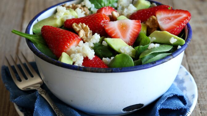 Kesällä maistuvat raikkaat salaatit, joista saa täyttäviä ilman lihaakin. Poimimme kirjasta Tovessonin Panzanellan ohjeen, joka tarjoillaan mansikoiden ja halloumin kanssa. Kyseessä on toscanalainen leipäsalaatti, jota kirjailija kuvailee täydelliseksi kesäruuaksi. Jos haluat salaatista ruokaisemman lisää belugalinssejä tai pastaa. Se syntyy 20 minuutissa.