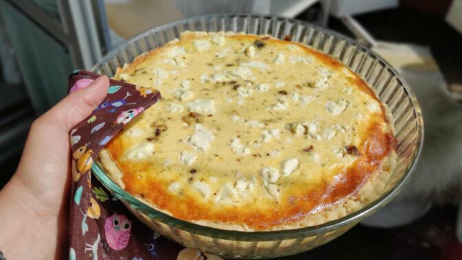 7. Paista piirakkaa uunin tehosta riippuen 40-50 minuuttia, kunnes täyte on hieman ruskistunut ja hyytynyt.