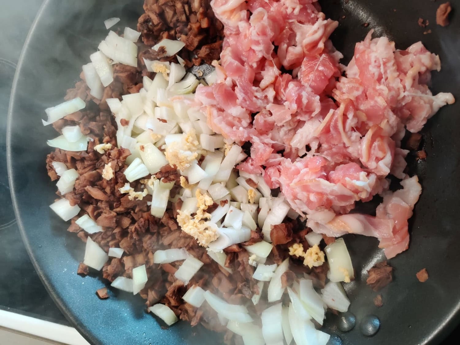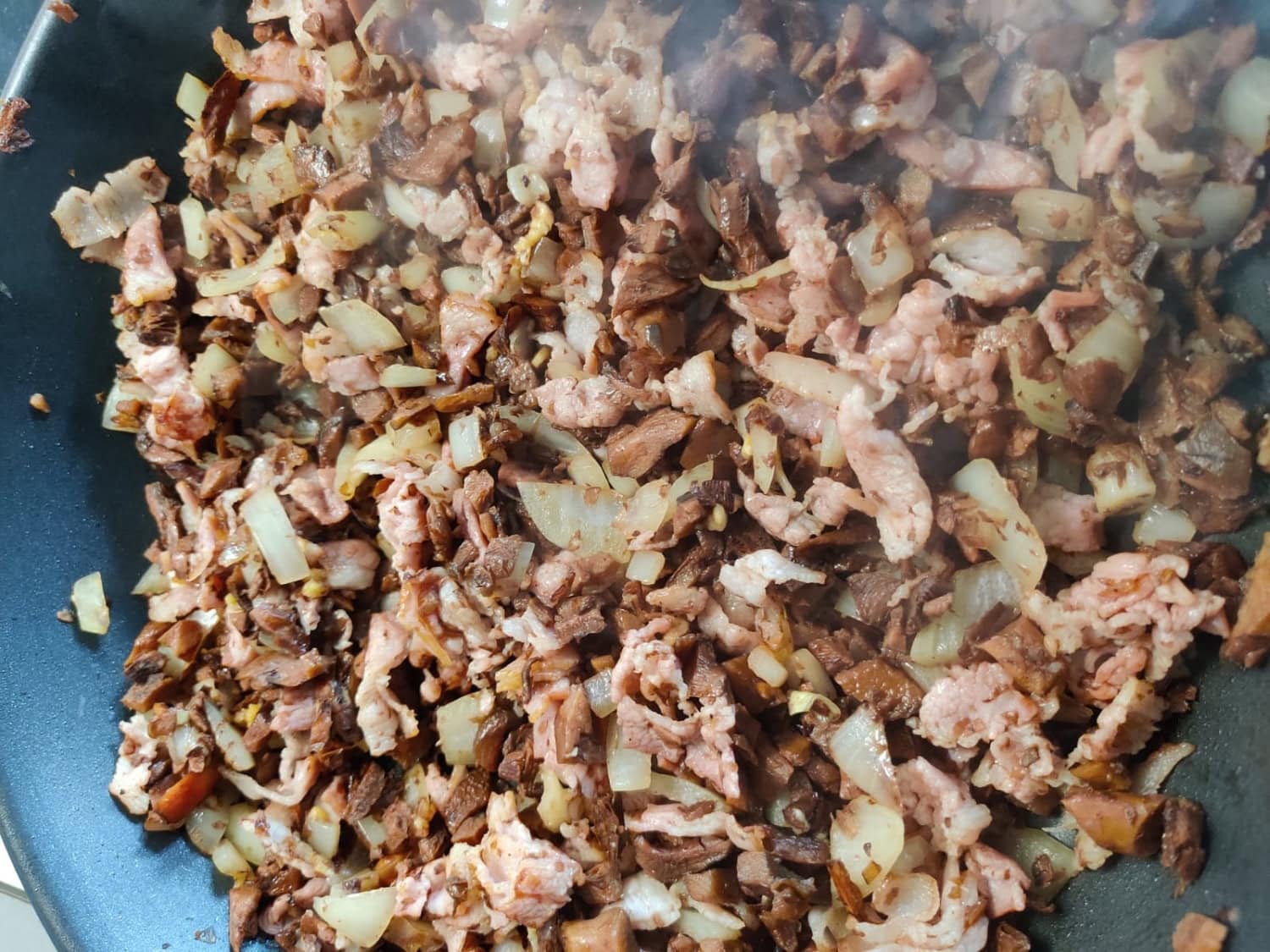 3. Puhdista ja pilko sienet pieniksi kuutioiksi. Kuutioi pekoni ja sipuli. Paista sienikuutioita pannulla niin pitkään, kunnes neste on haihtunut pois. Lisää pannulle pekoni ja sipuli. Paista kunnes sipuli on kuullottunut.