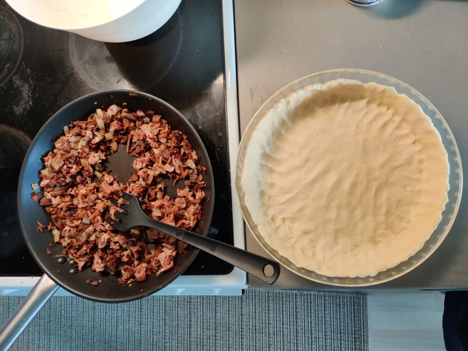 5. Mikäli taikina on laskeutunut vuuan reunoilta, painele niitä varovasti haarukalla takaisin ylemmäs. Levitä tämän jälkeen pohjan päälle paistettu sieniseos.