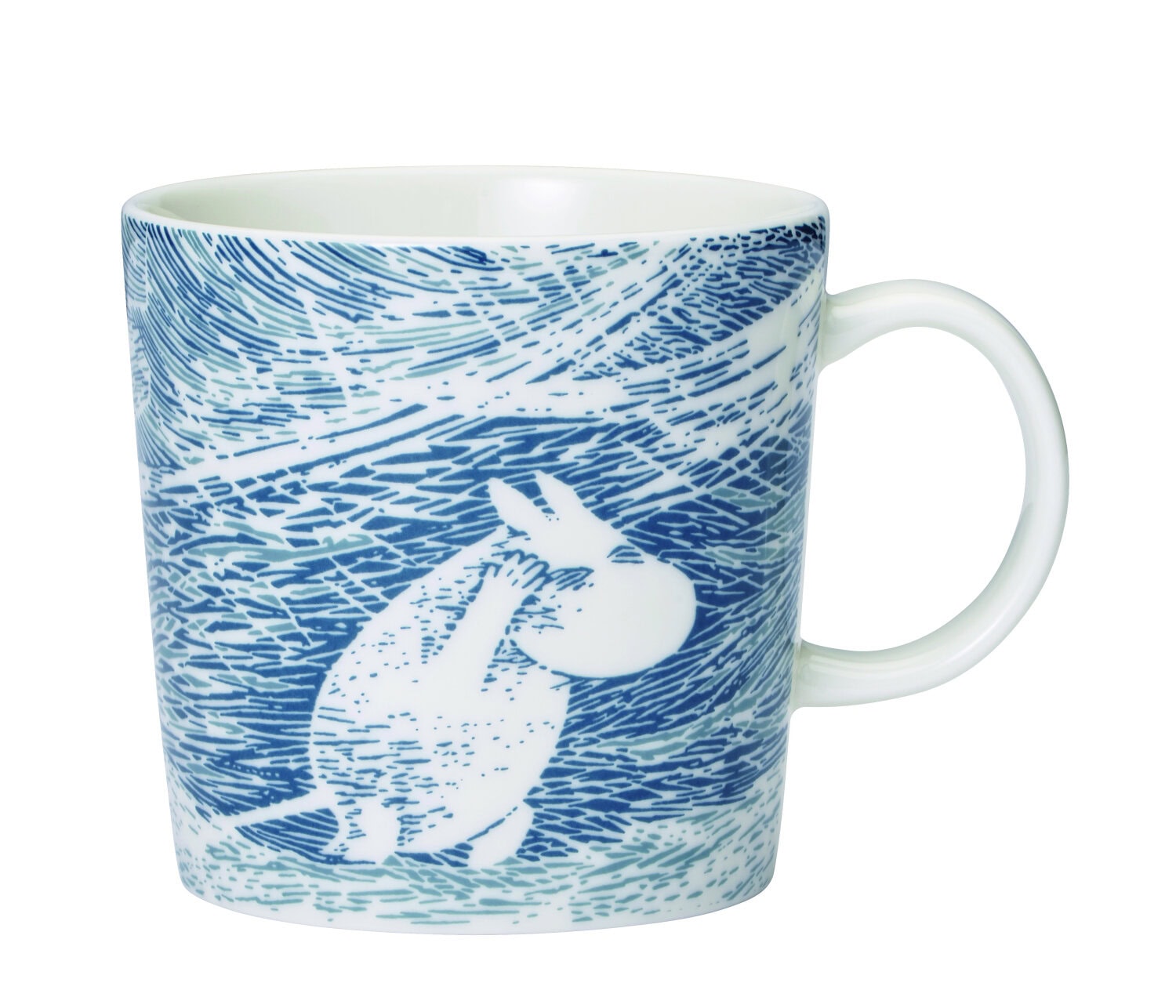 ”Alkuperäistä kuvaa on hieman muutettu vaihtamalla taustaväriksi tummansininen mustan sijaan ja siellä täällä on vaaleampaa harmaansinistä” kertoo kuvittaja-keraamikko Tove Slotte, jonka tehtävänä on muotoilla alkuperäinen kuva sopivaksi kaarevaan mukiin.