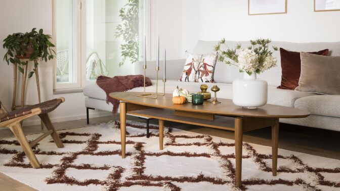 – Kalustemuotoilussa on selvästi nähtävillä, että pyöreät ja orgaaniset muodot tekevät vahvasti tuloaan. Väreissä puolestaan pinnalla ovat harmoniset ja murretut värisävyt. Syksyn värisävyjä tulevat olemaan muun muassa ruosteenpunainen, sammalenvihreä, beiget ja pellavansävyt, tummat ruskeat sekä sitruunankeltainen, rakennusyhtiö JM Suomen sisustuskordinaattori Johanna Fagerholm toteaa tiedotteessa.