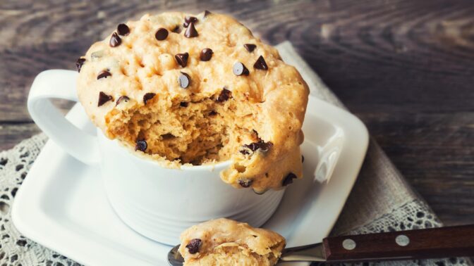 Mukiin tehtävä keksitaikina kruunataan suklaalastuilla, ja annos valmistetaan uunin sijaan kätevästi mikrossa. Voit lukea reseptin kokonaisuudessaan alta.