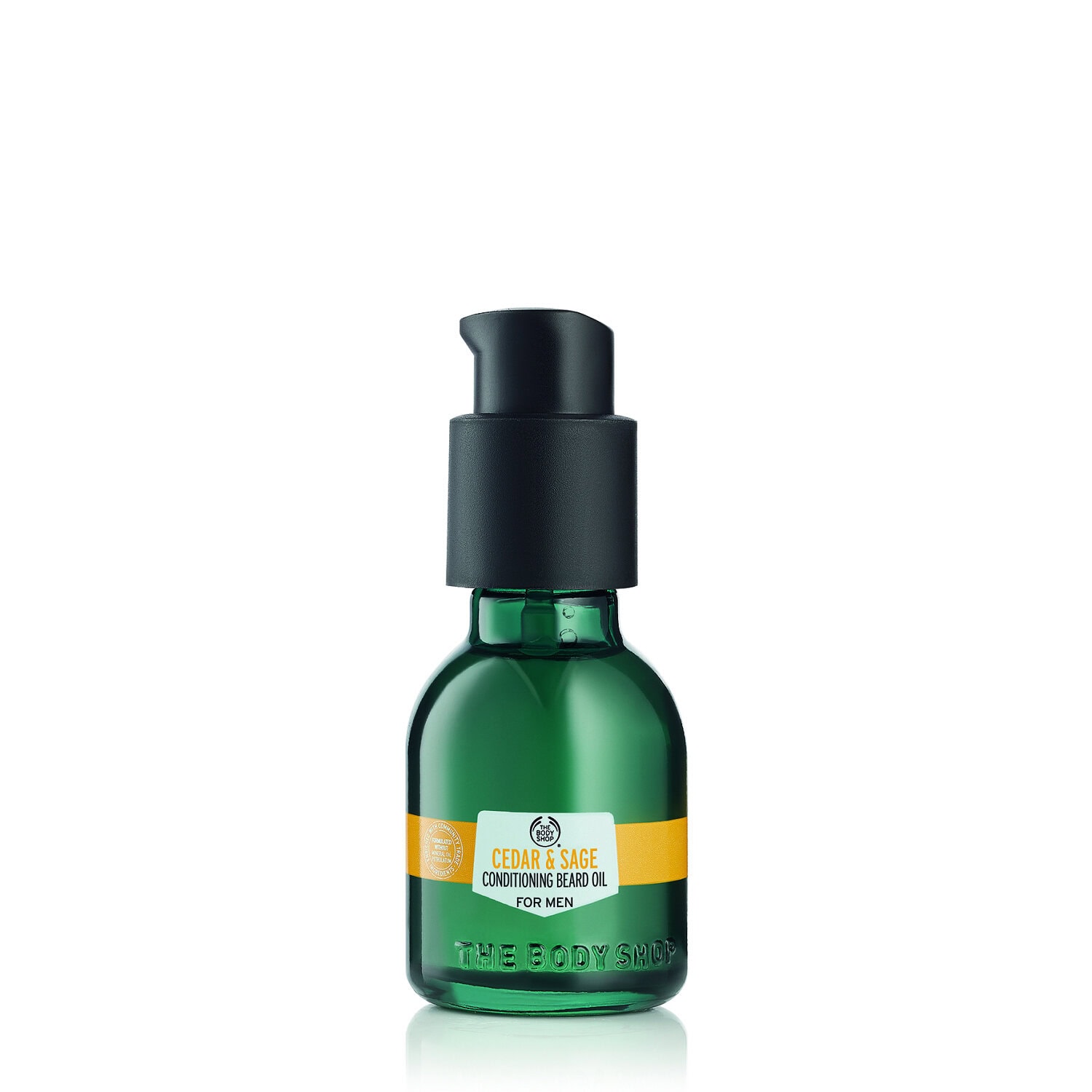 The Body Shopin partaöljyn kevyt koostumus jättää karvan pehmeän ja ihon ravitun tuntuiseksi. Cedar & Sage Conditioning Beard Oil 17,50 e, The Body Shop.
