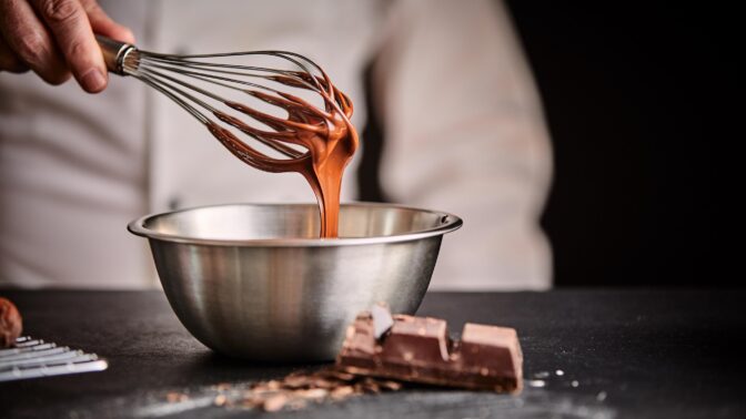 Sulata suklaa ja kerma varovasti vesihauteessa. Varmista, että käytössäsi on lämmönkestävä kulho. Riko keksejä suurina paloina suklaaseokseen.