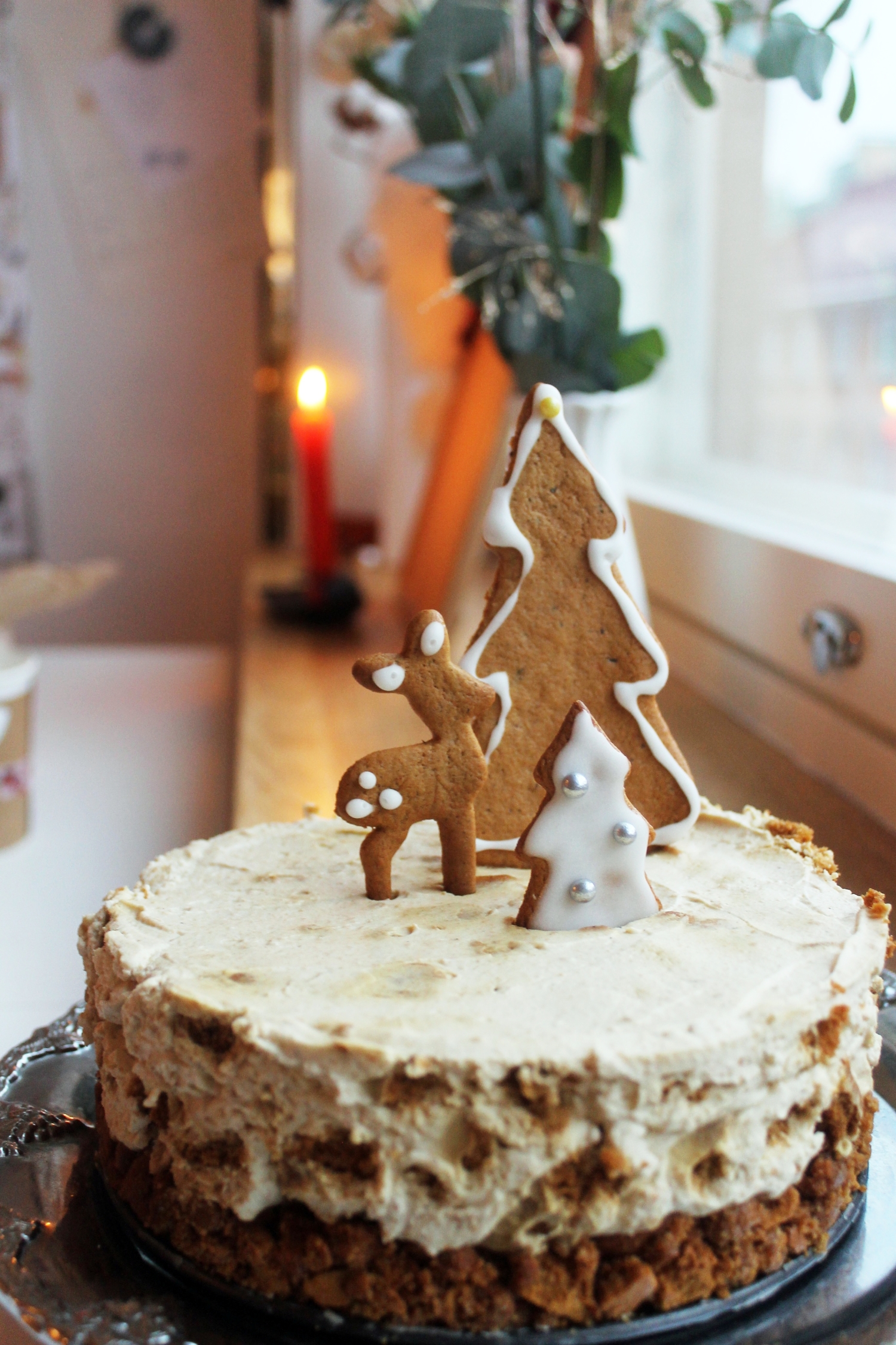 Vispaa kerma kuohkeaksi vaahdoksi. Sekoita joukkoon tuorejuusto ja vaniljasokeri. Voit myös käyttää valmista piparkakkurahkaa, mutta silloin kannattaa pienentää reilusti piparkakkujen määrää täytteessä. Murskaa piparkakut täytteeseen. Jos pidät sattumista, voit jättää joukkoon myös hieman isompia paloja. Vatkaa sekaisin. Levitä täyte pohjan päälle. Anna tekeytyä jääkaapissa muutama tunti, mieluiten seuraavaan päivään.