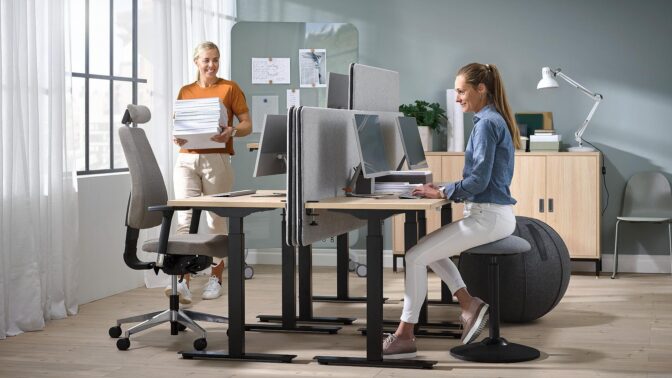 Vaihtoehto: Tee välillä töitä seisten säädettävän työpöydän ääressä. Kun vaihdat työasentoa istumisen ja seisomisen välillä, myös lihaksesi vahvistuvat. Ryhti paranee ja verenkierto vilkastuu.