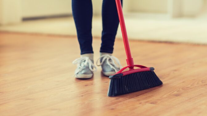 Kyseisellä videolla äiti kastaa hieman talouspaperia, jonka jälkeen lakaisee roskat sen päälle. Näin irtonainen lika tarttuu hienosti kosteaan paperiin ja lopputulos on kohtuullisen hyvä, kuten videolta näkyy.