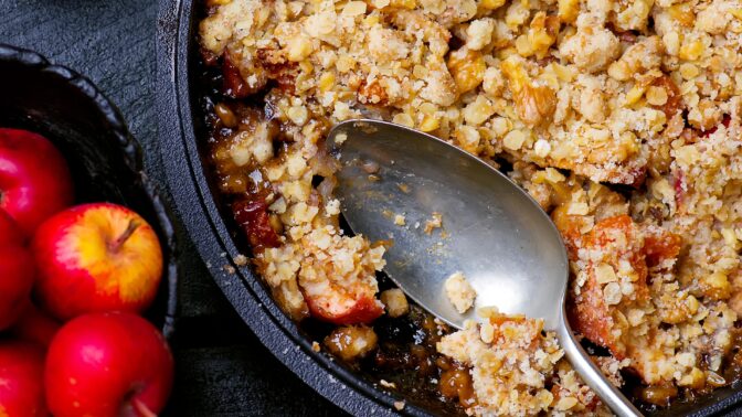 Rapea ja makea omena-kaurapaistos syntyy syksyllä helposti kotimaisista omenoista ja sopii ihanasti iltapalaksi tai jälkiruoaksi.