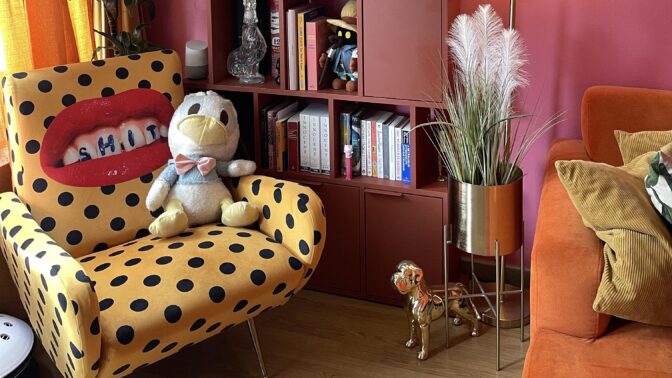 – Värikkyys lähti omista vaatteistani, tietyt muodot taas mid-century modern -tyylistä, joka oli ensimmäinen spesifi sisustustyyli, johon tykästyin, Laitinen kertoo.