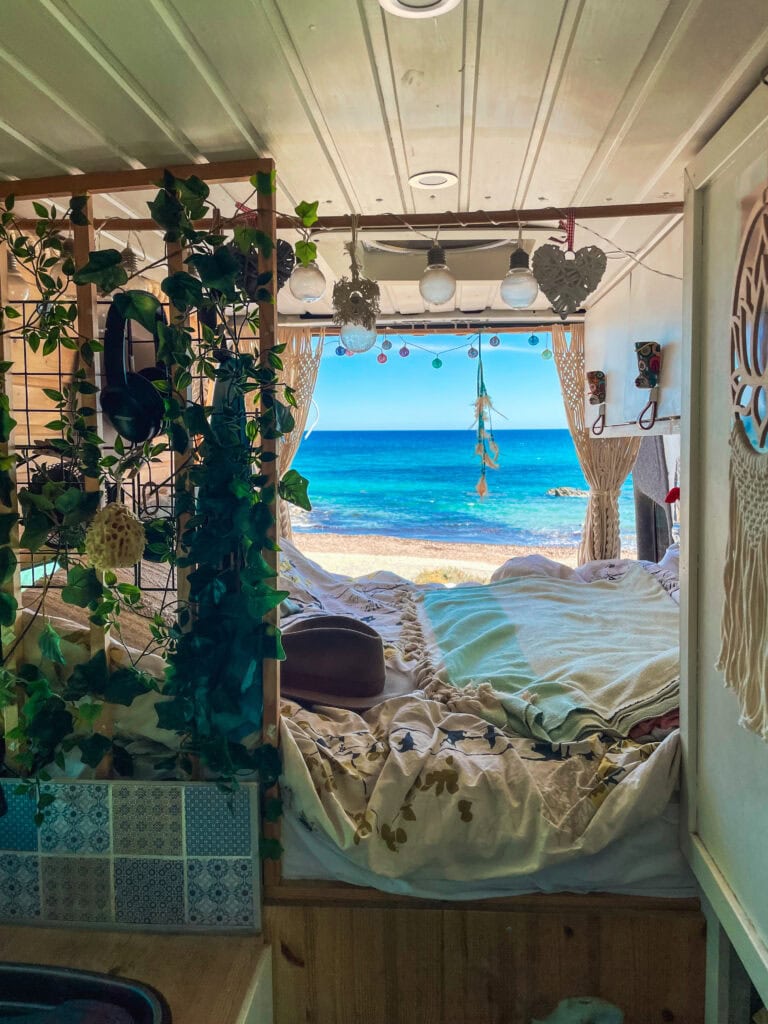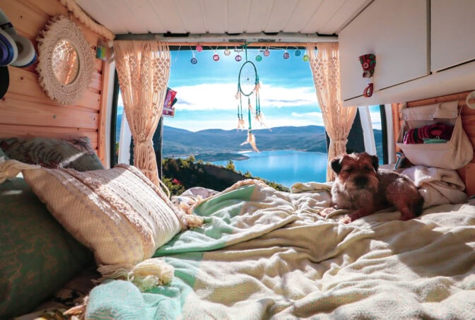 – Kun retkeilyautomme takaovet avaa, avautuu suoraan sängystämme toisinaan aivan mieletön maisema: esimerkiksi kimmeltävä Välimeri tai lumihuippuiset Alpit. Ne luovat upean livetaideteoksen ikään kuin kotimme takaseinälle.