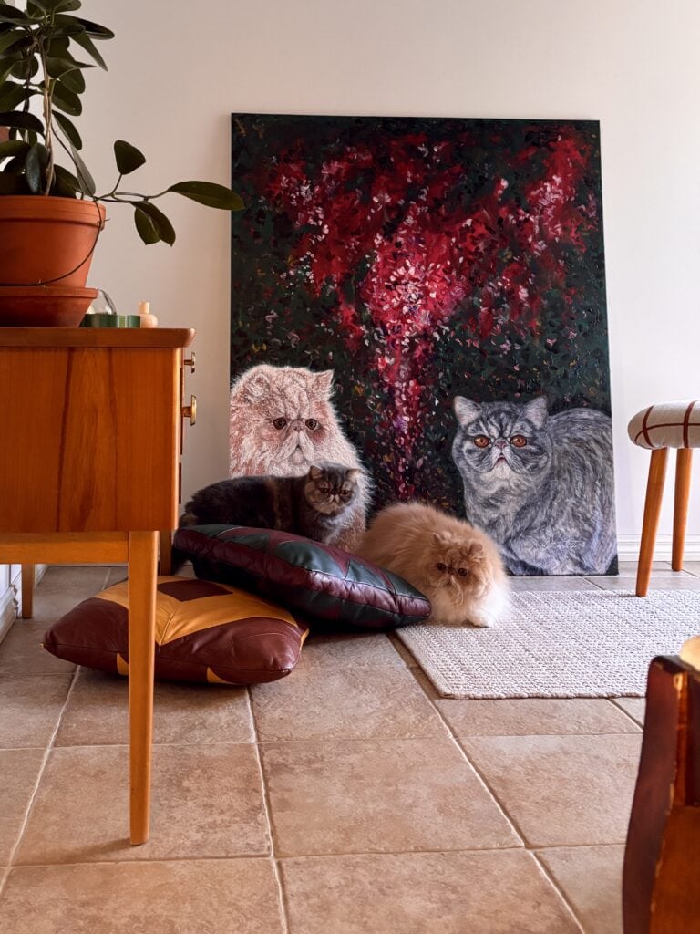 – Viherkasvit ja kukka-altaat olivat 70-luvulla muodissa ja niitä löytyy myös kodistamme. Viherkasvit valikoituvat kissojen mukaan eli sellaisia, jotka eivät ole myrkyllisiä kissoille, esimerkiksi maijat ja pullojukka, Kortteus kertoo.