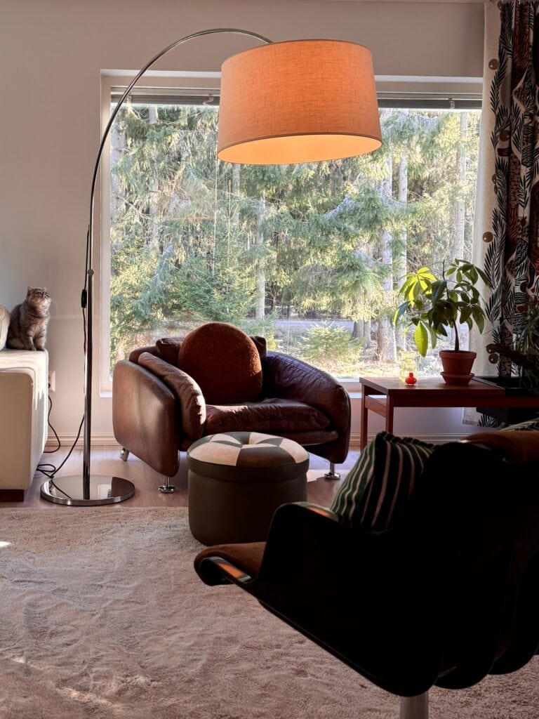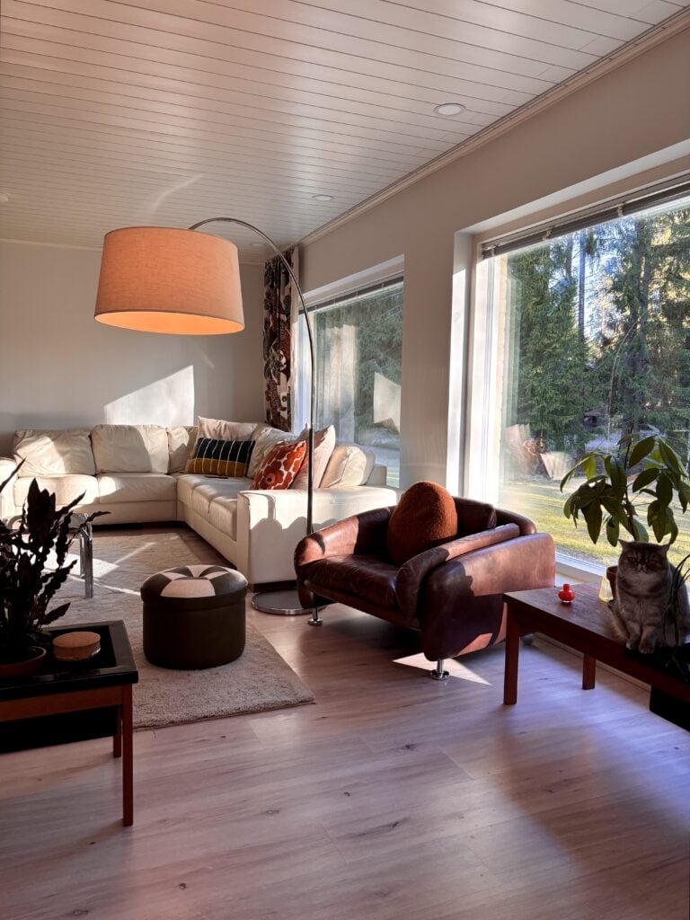 – Halusimme ehdottomasti säilyttää ja jopa tuoda 70-luvun tyyliä lisää, esimerkiksi isoilla olohuoneen ikkunoilla, joita ei ollut ennen remonttia, mutta istuu taloon mielestäni hienosti.