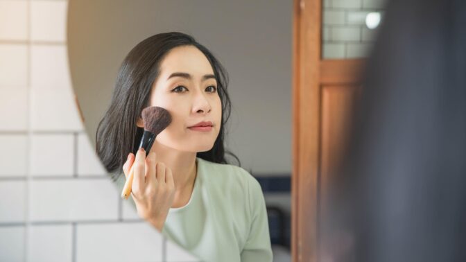 – Kun taas aurinkopuuteri korostaa lämpöä, joten sen sijouitus on hieman erilainen, nainen kuvailee ja lisää kasvojensa toiselle puolelle aurinkopuuterituotetta poskipäälle, otsalle ja nenän tyveen.